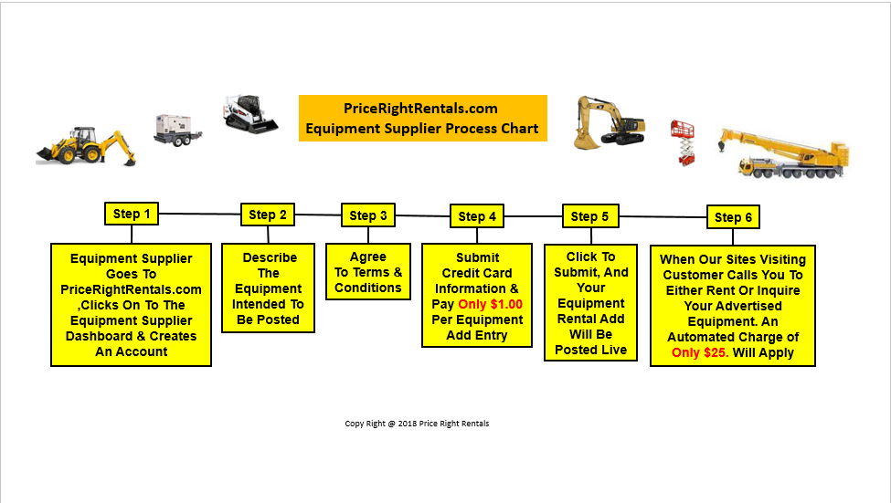 We look forward to serving you with our new and revolutionary advertisement platform. We will work very hard ot get your idle equipment out there working and generate a new costumer base for you. Price Right Rentals was designed to provide you with a highly productive and the most inexpensive form of advertising. Review the advertiser's terms, conditions and pricing below and take advantage of the most viable form of advertising in the rental market.